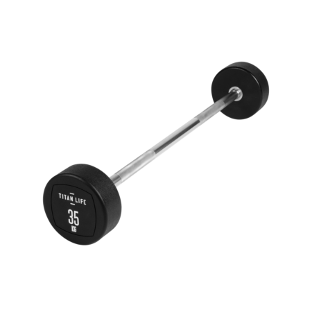 TITAN LIFE PRO Barbell er en vægtstang med fast vægt, som både kan bruges til at træne biceps og triceps. Vægtenheden er svejset fast til vægtstangen og beklædt med polyurethan. Den er egnet til træningscenteret, foreningsfitness mm. Fordelen med en vægtstang med fast vægt er, at der ikke skal bruges tid på udskiftning af vægtskiver, samt at vægtstørrelser har et spring på 5 kg. fra 10 – 45 kg.